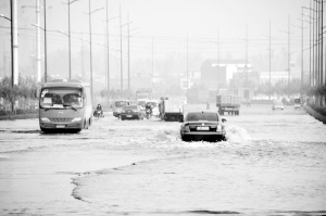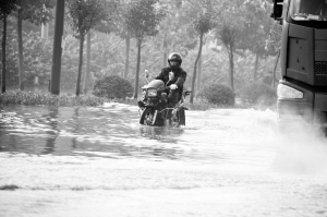 当日9时许,记者来到现场看到,只见几十米宽的周口大道上积水成河,积水顺着马路蔓延了近千米长,最深处达十几厘米,不但行人无法通过,就连不少过往车辆也是望而却步,只有个别底盘较高的大货车才敢通行。