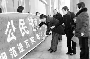 11月17日,由西华县老年协会举办的“道德规范从我做起”万人签名活动在县女娲广场拉开序幕,吸引了众多市民参与。当日上午的大雾和绵绵细雨没能阻挡市民签字的热情,一个多小时的时间,签字条幅上就留下了近千名市民的笔迹。图为一名市民正在条幅上签名。