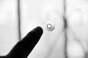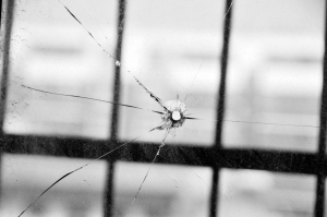 记者看到,袁先生住在小区最北一栋楼房的3楼,客厅的两扇窗户都是双层玻璃,每层玻璃都有5毫米厚,如果外层玻璃上有个黄豆大小的洞,内层玻璃上则会有个同样大小的坑。记者数了数,客厅的两扇窗户玻璃上共有8个洞孔,厨房的窗户上有1个洞孔。