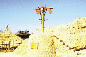 你只要看过《红高粱》,就能在这里找到许多熟悉的场景,那酒旗摇曳的十八里坡,那酒香扑鼻的酿酒作坊,那黄土坡上土垒的月亮门,九儿被花轿颠得七死八活后被抬进的麻风病人居住的院落,甚至当时拍摄用的铺盖还保留着原来的样子。没有到过西北农村的人,可能无论如何不能想象那是人住的房间,矮小的黄土垒起的小屋,黑的、朽的木头窗框上糊着发黄的窗纸,这还是个较富裕的人家,穷人的房子更是低矮黑暗的无法下脚了。来到《红高粱》电影中名为十八里坡的土城洞,就是“我爷爷”抢“我奶奶”的地方,如今是一大旅游景点,那条弯弯曲曲的小路是张艺谋请当地农民在一个晚上硬踩出来的,据说每人发了10块钱。如今这条路上,红男绿女游客川流不息,这情景在镇北堡的各景点——古堡凉亭、怀远镖局、《战争与爱》拍摄地随处可见。