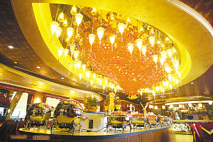 入夜后,在游船灯饰的照射下,犹如一座金光灿灿的皇宫漂浮在江面上。游船由我国著名雕塑家郭选昌按照中国传统画舫结构设计,船长60米、宽16米、高16米,共4层楼,可载客600人。(新浪)