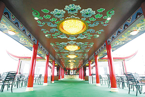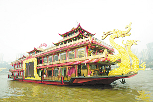 据悉,这艘按照五星级标准建造的游船,是最豪华的中国内河城市观光型游船。这艘游船以金色和红色为主色调,两条巨大的龙和凤峭立船首,船顶为中国3个古代宫廷楼阁建筑风格,船身两边的4层楼为若干红柱和数十个大红灯笼装饰。