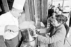 7时15分,面馆的卷帘门打开,一个年轻厨师和另一名女服务员开始向等待的老人们发排队卡,大伙都自觉地靠墙排成一行。不一会儿,热气腾腾的粥桶就被抬了出来,米粥熬得稀稠刚好,里面还放了红枣、花生和玉米,看上去相当诱人。两个年轻人娴熟地向老人们分粥,饭盒大的多舀一勺,小的舀满,不到一刻钟,一桶粥就分完了,在场的六七十位老者人人有份。“这粥喝得人心里暖和。”85岁的老人杨桂燕感慨地说,平常儿女们忙上班,从来没给她熬过粥,现在她看到分粥的两个年轻人感觉很贴心。