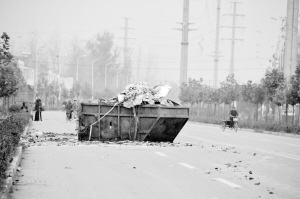 昨天中午,周口市区工农路上,一个大垃圾箱停放在路中间,占据了约1/2的机动车行驶路面,给过往行人带来不少安全隐患。