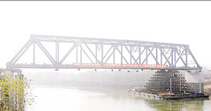 赵寨颍河特大桥全长2968米,是漯阜铁路增建二线重点控制性工程。其中,主桥设计为一孔128米特大钢桁梁,高16米,钢桁梁总重量为2200余吨。此桥在跨度和规模上都是目前我国双线简支钢桁梁铁路桥中最大的,施工建设技术含量较高,难度较大。此次,九江中铁科工九桥公司采用浮拖法架设成功,为今后同类大跨度桥梁采用浮拖法施工积累了经验。