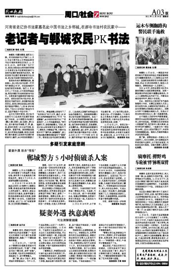 本报讯 冬露润墨香,暖阳沁心脾。河南省省委书记卢展工11月11日在中国书法之乡郸城县郝寺书法村调研的消息见报后,11月22日、23日,原河南省广电厅厅长、省老记者协会主席宋国华带领13名省老记协书法家来到该村与农民书法爱好者切磋书法艺术。看到农民书法爱好者深厚的书法功底,老记协书法家们纷纷惊叹叫好。