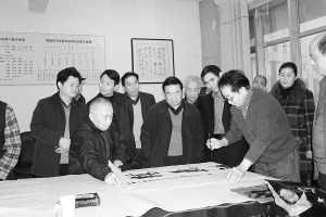 虽然初冬的早晨薄雾轻袅、寒意袭人,加之老记协书法家一行平均年龄超过65岁,但这丝毫挡不住他们的艺术热情。他们11月22日早上7时出发,12时赶到郸城县城,简单用餐后径直来到郝寺书法村。当看到该村道路两旁写满书法标语、农民言谈尽知书法术语、家家挂有书画作品时,原省新闻出版局局长、省老记者协会副主席刘海程不禁连声赞叹:“上到80多岁的老汉,下至五六岁的孩子都会写书法,这里不愧是个书法村呀!”