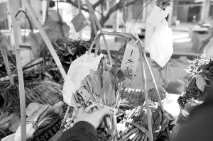 在广西横县百合镇罗凤村,菜篮上挂着各种纸片做成的标价牌和红色、白色的装钱塑料袋(11月24日摄)。