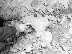 昨日上午,记者来到曾先生发现灵芝的地方,发现该灵芝生长在距离一片老树林不远的一个墙角处。拨开落叶,记者看到灵芝的根部依稀可见。曾先生说:“前段时间,我在这里修电线时,突然感到脚下一硬,拨开地上的落叶,我就发现了那株野生灵芝。”记者仔细观察发现,该野生灵芝呈灰褐色,个头很大,形状奇特,看上去有明显的层次感(如图)。曾先生说,他采下灵芝回家称了一下,发现这株灵芝足有一斤多重。