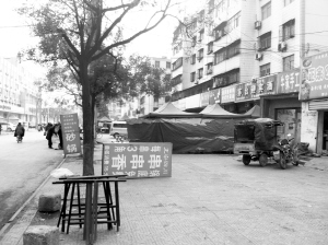 七一路和交通大道之间的工农路路段主要以固定门店出店经营占道为主,不少经营者从自己门店门口向着机动车道延伸出一片区域,占据人行道划地经营。其中有一些小饭店搭上棚子摆上饭桌(如图),招揽食客,把人行道变成了用餐之地。育新路与工农路交叉口由于流动摊贩的加入,占道更为严重,有的摊贩甚至将摊点摆在了机动车道上。