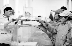 11月28日,几名环卫工人在乌鲁木齐市沙依巴克区八一街道办事处新疆职业病医院就餐点内领取早餐。