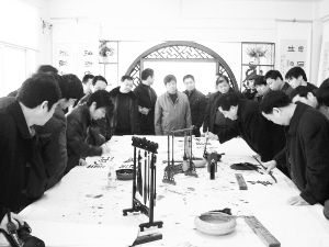 当日,周口市第一届书法家协会隶书专业委员会座谈会在项城市举行。会后,30余名书法家现场挥毫泼墨,互相切磋书法技艺。晚报记者 金月全 摄