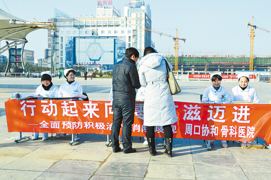 12月1日是“世界艾滋病日”。为提高公众对艾滋病危害的认识,唤醒人们采取措施预防艾滋病的传播和蔓延,周口协和骨科医院医护人员积极响应政府号召,走上街头进行宣传。 (郭伟 摄)