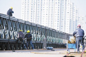昨天上午,沙颍河周口大道大桥上,几名工人正在拆卸大桥上的钢桁架。据介绍,拆卸工程预计需要15天,才能把用1600多片钢桁架在原桥上搭建的近4米高、6.5米宽的钢桥拆卸完成。