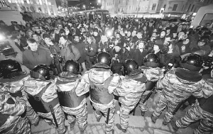 大约5000名抗议者5日在瓢泼大雨中走上莫斯科街头,高喊“革命!”“俄罗斯不需要普京”和“为了一个不搞阴谋诡计的俄罗斯”等口号,与警方展开对峙。警方与一些示威者扭打起来,并将其包围,防止他们向克里姆林宫前进。一些示威者试图逃离并奔向克里姆林宫,至少有30人被大客车拉走。