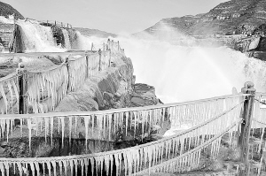 12月9日,壶口瀑布出现冰挂景观。近日,受强冷空气的影响,黄河中游气温持续下降,壶口瀑布飞溅的浪花和弥天水雾在两岸的岩石和护栏上凝结成美丽壮观的冰挂,晶莹剔透,造型各异,与瀑布中飞舞的彩虹交相辉映,形成壶口瀑布冬季独特的迷人景色,吸引了众多游客和摄影爱好者。新华社发