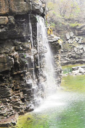 一个小时后,来到第二梯次——老龙头瀑布下方,瀑水泛着白色从崖顶一泻而下,巨大的水柱撞击在岩石上,发出雷鸣般的轰鸣。在水柱变为瀑布的过程中所形成的飞溅水珠成了水雾,好一个人间天堂!如刀斧削劈的悬崖,撼人心魄,人站在那里显得渺小无比。不敢耽搁,继续赶路。在乱石沟下的岔路口小憩后,沿石坡而上,折向天梯。石坡的石头堆积得松散无序,稍不留神,就会有石头滚下。害怕碎石从空中降落,我中途不敢休息,背着背包,手脚并用,缓慢前行。上天梯后,看到了一座小庙,知道抱犊村快到了。又走不远,碰到了到山中放羊的抱犊村的村民,虽然村民衣着朴实,但满脸憨厚,又带着一种说不出的精神气。攀谈中,得知放羊的村民叫姬喜群,他家也有驴友歇脚的地方。喜群热情地帮我背背包,我跟着他经过一条宽宽的河,踏着河中大大小小的石块,走进向往已久的村庄。
