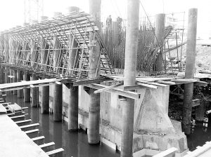 首先是桥位上方11万千伏的高压线路牵制了新桥施工的全局进展。为保证新桥施工顺利进行,市住建局通过与市电力公司的协商,决定将影响施工的这条跨河高压线路向西平移50米。经过市电力公司前期勘察、论证、设计、报批程序,今年2月21日,市电力公司施工人员进入现场,对这条高压线路的5个电杆进行迁移。直至今年5月26日,高压线路才迁移完毕。“从2月16日开工至5月26日高压线路迁移完毕,项目部在打桩机、吊车等大型机械因高压线‘碰不得’、‘放不开手脚’的情况下,在保证质量和安全的前提下,见缝插针依旧完成了32根新桥桩基。高压线路迁移完毕至7月29日这段时间,项目部加班加点完成了剩余的65根新桥桩基。”