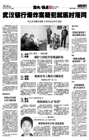 武汉银行爆炸案疑犯就医时落网
