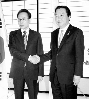 12月18日,正在日本访问的韩国总统李明博同日本首相野田佳彦在日本京都举行会谈,但双方在引人注目的慰安妇问题上未取得突破。图为日本首相野田佳彦(右)与韩国总统李明博在会谈前握手 新华社发