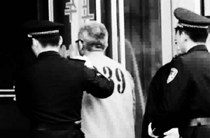 早上8时,押送涉案人员的车队,缓缓驶入法院西大门。因为前一天的案件没有审理结束。昨天,杨一民和其他十几名涉案人员一同来到法庭。下车时,前一天审判的涉案人员在先,杨一民则穿着“039号”红马甲(上图),在队伍的最后面进入法院。