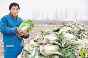 当天下午,记者赶到豆门乡夏刘营村,在村南头一片菜地里,见到了王鹏飞。“你看这白菜堆在地里,要白白烂了心痛人啊!”王鹏飞说,他今年种了5亩地的萝卜和白菜,每亩产量都在5000公斤以上。“可是丰产不丰收啊!每亩地光成本就投进去1200多元,投进去5亩地的钱连1亩地的本也没有收回来”。他说他早出晚归,也就卖了1000多公斤,按现在的市场零售价每公斤0.4元算,卖了不到500元。除了送给亲戚、邻居的,大量的萝卜、白菜还躺在地里。(下转A06版)