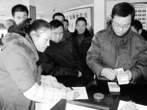 为确保元旦、春节前农民工工资的支付兑现,商水县加大劳动监察执法力度,今年一举清欠农民工工资80余万元。图为12月22日,农民工在该县劳动监察人员的见证下领取工资。