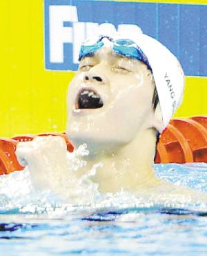 7月31日,中国选手孙杨在本届世界游泳锦标赛中以14分34秒14的成绩夺得男子1500米自由泳冠军,并打破了尘封10年之久的世界纪录。14分34秒56的原世界纪录是澳大利亚名将哈克特在2001年7月创造的。