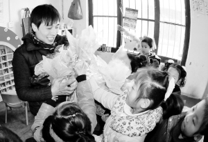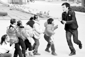 岳璐斌第一次到班里和孩子们见面时,孩子们都笑了起来,他们拍着手唱着歌欢迎“叔叔”的到来。孩子们的纯真让岳璐斌心醉。在这里,岳璐斌真正实现了“学以致用”,他不仅是幼儿园大班的音乐教师,还担负着舞蹈、美术、体育、科学的教学任务,样样精通,每天的工作总是排得满满的。中午孩子午休时,他还要和保育员一起看着,因为总有那么一两个捣蛋鬼不好好睡觉,只要他这个“孩子王”一过去,捣蛋鬼就会假装睡着了,然后就真的睡着了。“从来没有感觉累过,和孩子们在一起,快乐而充实。”岳璐斌很享受现在的工作状态。