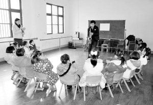 音乐响起,和着《月亮代表我的心》的优美旋律,岳璐斌投入地吹起萨克斯,身体随着乐曲节奏大幅度地摇摆。他的面前,几十名幼儿园的小朋友坐成一圈,凝神聆听,用手打着节拍。就是平时最淘气的小朋友,也没有嬉戏与喧哗,他们全都沉浸在美妙的音乐里。