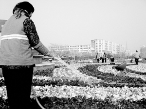 12月26日,园林绿化工人对新栽植的盆花进行浇灌(如图)。连日来,项城市先后购置紫叶甘蓝、黄叶甘蓝等10万余盆盆花,在城区主要干道两旁进行盆花组摆,喜迎新年的到来。