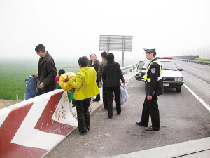 临近“双节”,一些外出务工人员陆续返乡。有些群众为图方便不顾安全,在高速公路上等车。近日,我市高速交警通过增加巡逻次数、警车跟随客车喊话等方式提醒驾驶员不要在高速公路上停车、教育群众不要在高速公路上等车。图为高速交警在教育刚下车的乘客。