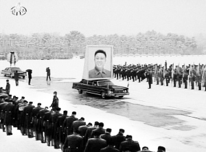 28日的平壤天降大雪。下午2时整,在军乐队低沉的哀乐声中,覆盖着朝鲜劳动党党旗的灵车从锦绣山纪念宫广场西侧缓缓驶出,灵车前的两辆黑色带队车上,分别安放着金正日的巨幅画像及花圈,花圈的黑色缎带上写着“金正恩”。金正恩在灵车右前侧手扶车辆,与朝鲜人民军总参谋长李英浩、朝鲜人民武力部部长金永春、朝鲜国防委员会副委员长张成泽等在灵车旁步行护送。