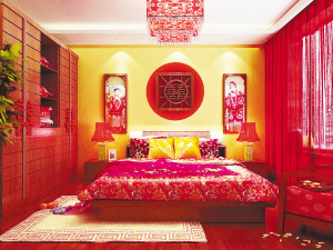 传统意义上的婚房颜色多用大红等暖色调,大红大紫是中国传统的喜庆颜色,即使在装修过程中整个风格没有暖色调,最后在配饰上同样会选取相应的大红色地毯或红色灯罩,软装饰多用暖色系,这样才能感受到强烈的新婚气氛,另外在视觉中心位置摆设大尺寸婚纱照,也能给客人留下深刻的印象。主旨是强调视觉效果,增添区间氛围。