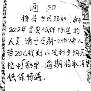 本报综合消息“接上级部门指示:2012年享受低保的人员,请于12月底前每人带20元到该村委购买福利彩票,否则取消低保资格。三汶村村委会。”近日,这样一则通知出现网上,立即引来众多网友关注。享受低保人员要购买福利彩票,是今年刚上任广西壮族自治区武宣县思灵乡三汶村党支书的潘某的“创新”之举。