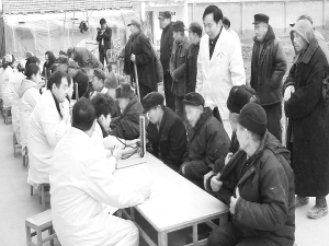 本报讯 郸城县卫生局在“双节”来临之际,组织全县各乡镇卫生院和县城各大医院分批组成医疗服务队,下乡为老人体检,并实施轻微病症免费治疗,让农村老人很是感动。12月29日,南丰镇医疗服务队到该镇敬老院为老人免费体检(如图)时,一位老人激动地说:“你们不仅给俺体检,还免费送给俺药,治疗俺的腰腿疼病,真是做到为人民服务了!”