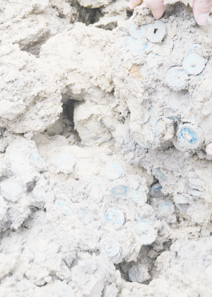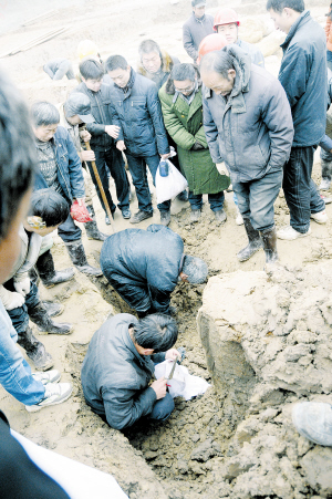 当天中午,记者在现场看到,挖出古钱币的地方在“择邻名苑”将建的8号楼的位置,位于工地最南端。现场围了不少附近居民,几名民警正在维持秩序,考古人员正仔细清理。一工人告诉记者,发现古钱币的地方距地面有4.5米左右。“古钱币是一摞摞的,排列整齐(如图二)。”一考古人员说,这些钱币大小不一,钱币上刻着“崇宁通宝”“崇宁重宝”“元丰通宝”“元佑通宝”等字样。