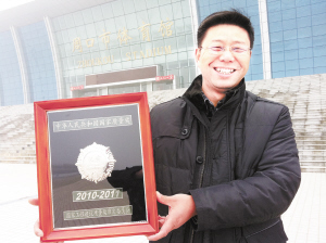 右图:市体育中心党支部书记夏涛手捧奖牌乐开怀。
