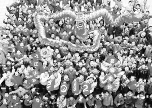 2011年12月31日,江西省九江市九江小学的200多名学生展示他们亲手制作的中国龙和贴有“2012”字样的红灯笼,迎接2012年的到来。 新华社发