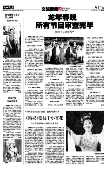 本报综合消息 目前,龙年所有节目已审查完毕,2012年1月2日起已经开始排练。一台春晚40几个节目,目前记者掌握20余个,春晚雏形初现。