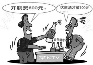 广州市民刘先生在某KTV准备打开自带的100多元的清酒时被索要600元开瓶费,并且不提供发票。KTV值班领班称收费标准是按照同类酒水的最低价格来收取的,并表示公司没有书面材料。对此,工商物价部门均表示,KTV收取“服务费”合理,他们也无权干涉。(1月3日《广州日报》)