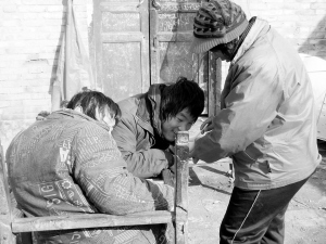 12月22日上午,记者来到贾滩镇方庄行政村赫庄自然村采访。武文英的家坐落在村子的东南角,在一个不大的院内,北侧是3间红砖瓦房,东侧是两间偏房。院内一个约两米长、1米宽的小木推车上,呆呆地趴坐着两个20岁左右的男子。哥俩正在母亲的伺候下沐浴着冬日的阳光。得知记者来采访,慈母武文英一边给两个儿子添衣、喂饭,一边讲述自己家庭的心酸和磨难。