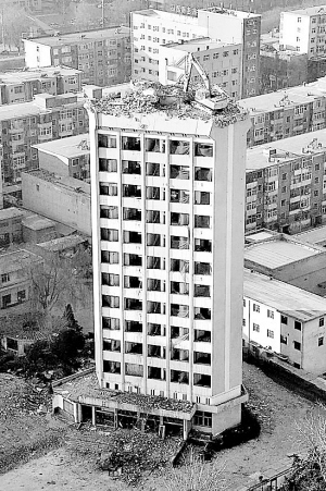 近日,几幅关于“太原挖掘机在12层楼顶作业”的图片(上图)在网络中热传,许多网民看得大惊失色:这个庞然大物如何跑到十几层楼的楼顶上?它在上面如何作业?安全吗?据悉,事情发生于1月5日山西太原市万柏林区迎泽西大街的山西科技大厦宾馆顶层。目前,当地安监局以存在安全隐患等原因,对该拆迁的施工单位下达了停工通知书。于旺 摄