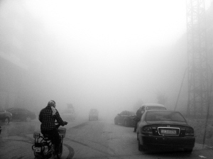 1月9日7时30分,一团大雾突袭郸城县城,导致能见度不足5米。两个小时后,在太阳照射下,大雾慢慢散去。图为行人在雾中行走。