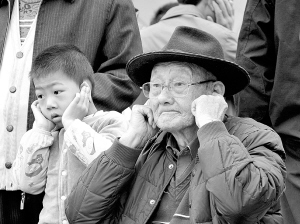 ▲不是我们爷俩搞怪,是礼炮声太刺激耳膜了。 沈子森 摄