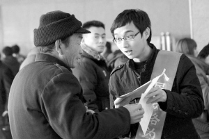 1月11日,在威海火车站,张平(右)在返乡前向人们发放自己印制的电话购票流程示意图。