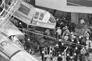 2005年4月25日早晨,福知山线一列快速通勤列车在兵库县尼崎市一处弯道因没有减速而脱轨,两节车厢撞入路边一栋公寓楼,司机和106名乘客死亡、562人受伤。