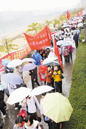 1月15日,市民冒雨参加在福州闽江公园举行的万人健步行活动。当日,由国家体育总局登山运动管理中心、福建省体育局、福州市人民政府主办的2012年全国第二届徒步健身大会暨福建福州第八届十万人健步行活动在福州举行。活动设主会场和分会场,共有10万多名市民参加。
