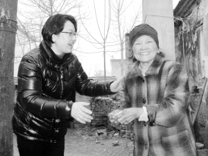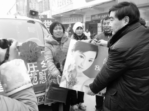 1月13日,商水县张庄乡对该乡100名道德模范人物进行了表彰,并向他们发放了慰问品。图为孝老爱亲模范赵麦英从乡领导手中接过慰问品。晚报记者 宋风 摄