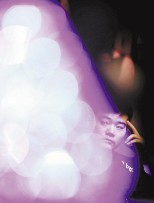 1月15日,中国选手丁俊晖在大师赛冠军奖杯旁沉思。当日,在2012年斯诺克大师赛首轮比赛中,丁俊晖以4比6不敌英格兰名将奥沙利文。新华社发(唐诗摄)